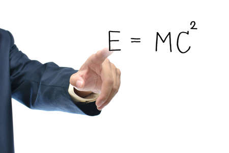 hand of a young person writing the Einstein formula on a blackboard with a chalk
