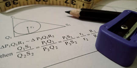 notebook with various mathematical and geometric formulas on the background of a school board / task for returning to school