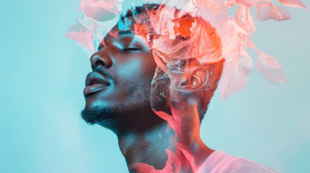 A young man stands with his eyes closed, exhibiting a peaceful expression as colorful floral patterns blend into his profile.