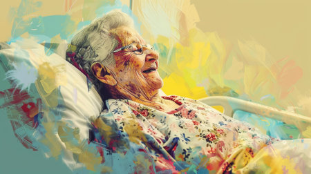 A woman is smiling in bed. She is wearing a floral print dress. The painting is colorful and lively