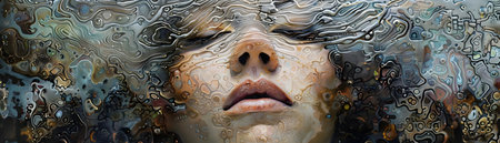 A close-up oil painting of a womans face in the style of hyper-realistic water, showcasing intricate details, vibrant color, and a unique scuff mark on the subjects face The texture and technique