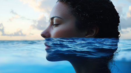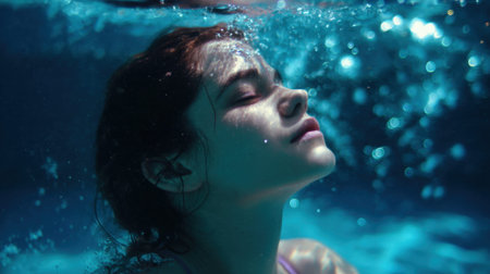 Submerged in liquid tranquility, a woman's portrait beneath the water's surface captures the essence of aquatic serenity, emphasizing her connection with the ocean's profound calmness