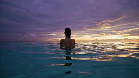 Peaceful woman standing barefoot in shallow water, reflecting sunsets purple and orange glow across tranquil ocean surface. Serene woman standing in shallow water, experiencing peaceful moment sunset