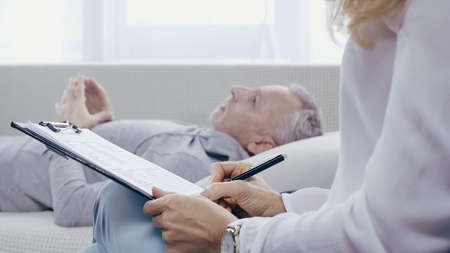 psychologist holding clipboard near blurred middle aged man lying on sofa during consultation