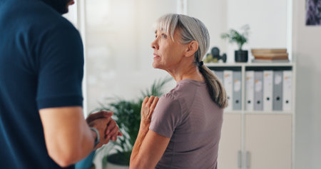 Physical therapy, senior woman or patient at consultation for problem, inflammation or arthritis. Person, chiropractor and healthcare for injury, rehabilitation and recovery of muscle osteoporosis