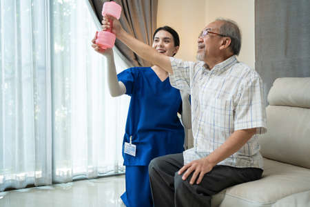 Asian nurse at nursing care support sick senior older man for therapy. Young woman Career Therapist serve physical therapy for older patient exercise with dumbbell. Physiotherapist Insurance concept.