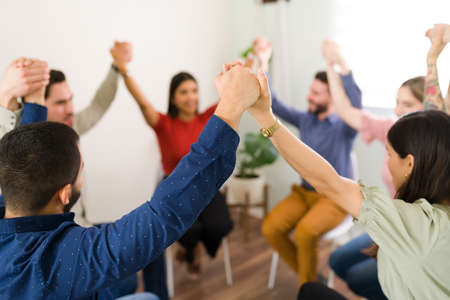 Close up of young women and men holding hands and celebrating the end of their support group to solve mental health problems