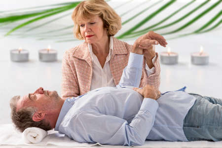 Therapist man doing Holistic therapy Reiki to a woman. Energy treatment with the heat of the palm hands. Japanese energy healing. Wellness, health, relaxation, well-being and alternative medicine concept.