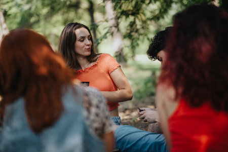 Group of friends enjoying a sunny day in the park playing cards and spending time together