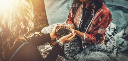 Fortune teller reading palm of her friend and explaining what to expect in near future