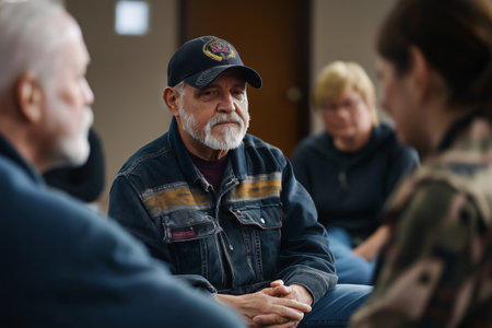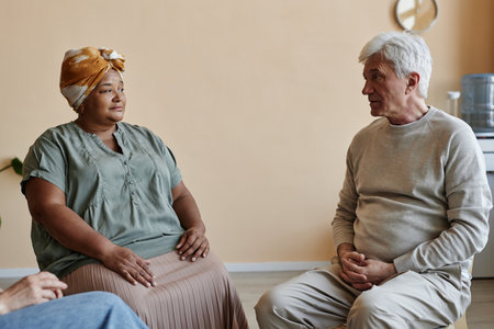 Group of senior people sitting in circle at mental health support group with focus on white haired man sharing