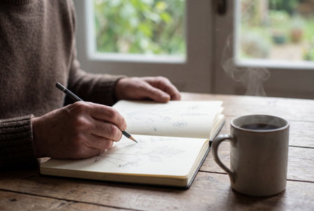 Male hands hold a pencil to draw detailed flowers in an open sketchbook on a textured wooden surface beside a mug of steaming hot tea with a blurred garden window background.