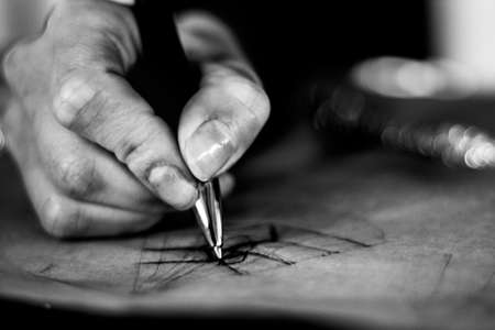 Closeup of drawing mans portrait at the desk