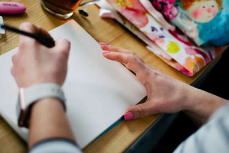 Closeup of female hand painting sketch on paper notebook with pencils. Woman artist at work