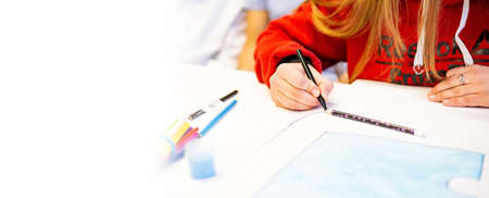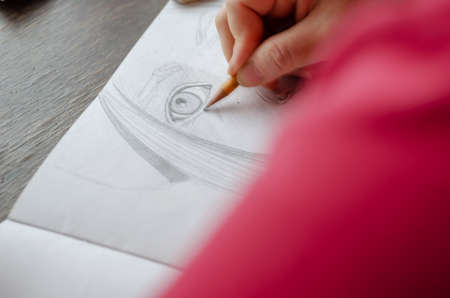 Hands of a girl drawing with pencil