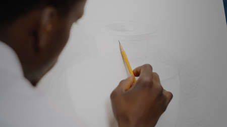Close up of black hand drawing with art pencil on white canvas at studio. Artist of african american ethnicity creating vase design for modern masterpiece concept. Successful fine art