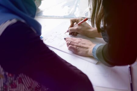 Female Architecture teacher at work. Female professor explain architectural projects to students. Beautiful female university architecture professor explain lessons to multiethnic students.