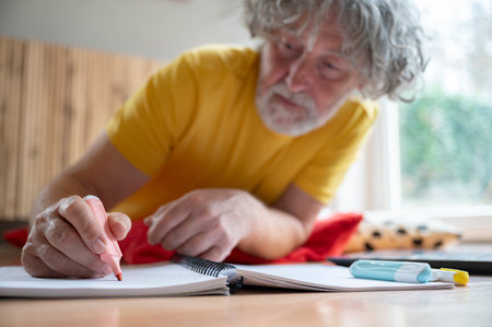 Low angle view of a senior man in yellow shirt casually lying on the living room floor studying and underlining important informations with a marker.