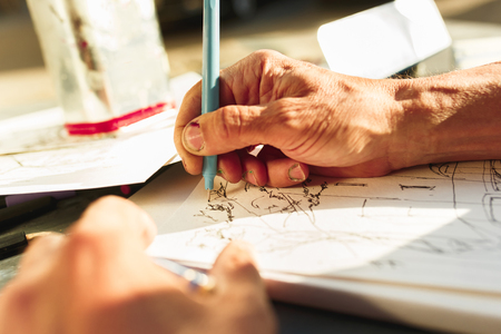 Close up shot - hands of professional tailor, designer drawing fashion sketch at atelier, studio. Dressmaking, creativity and tailoring concept