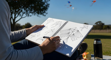 A person enjoys a sunny day in a park, sitting on the grass while sketching various kite designs in a spiral notebook. With colorful kites flying in the blue sky behind them, the scene represents creativity, planning, and the joy of a relaxing outdoor hobby.