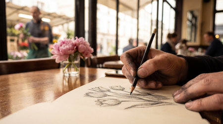 A person draws tulips on paper with a pencil while seated at a wooden table inside a venue. A vase of pink peonies sits near the drawing. A florist stands outside a window in the background.