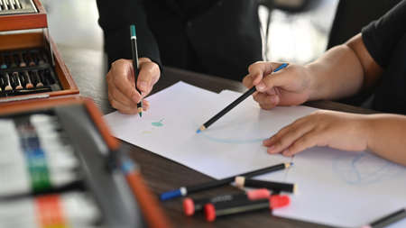 Close up view art teacher helping helping her student drawing.