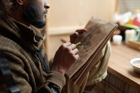 Interior scene of adult artist sketching his next artwork at workshop