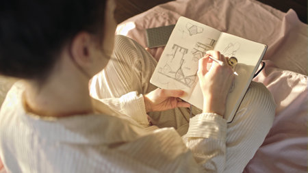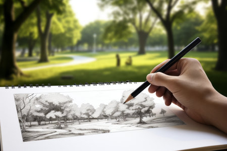 closeup of unrecognizable caucasian woman sitting outdoors, drawing on a paper on a notebook with graphite, concept art, copy space.