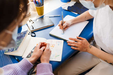 Young white women in face mask doing sketches while working at workshop