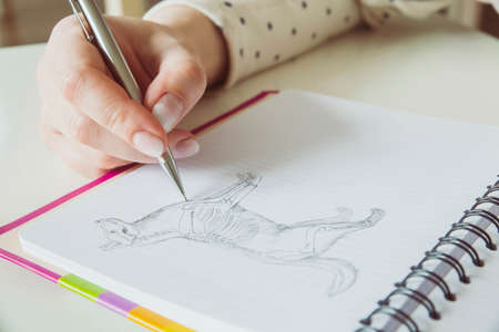 Woman draws the anatomical structure of a dog with a pencil