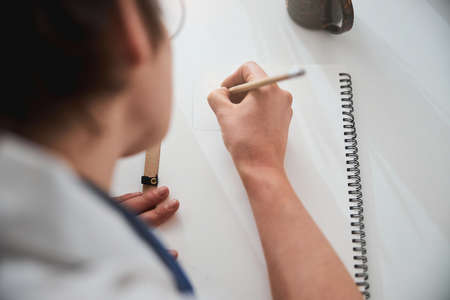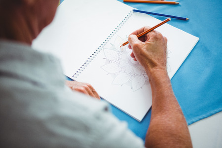 Close-up of a man drawing a sketch on a notepad