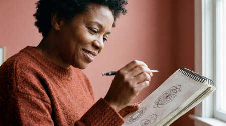 A woman is focused on drawing detailed mandala patterns in her sketchbook at home in a relaxed atmosphere.
