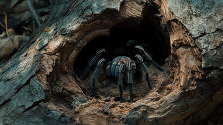This captivating image features a tarantula emerging from a hollow tree trunk, highlighting the rich textures of the wood and its natural habitat.