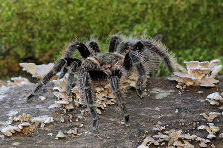 A black tarantula looking for prey on a rotting log overgrown with fungus.