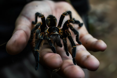 A tarantula rests gently on an outstretched hand. The spiders hairy legs and body are on full display, creating an intriguing contrast with the human skin. The scene is dramatic and eye-catching.