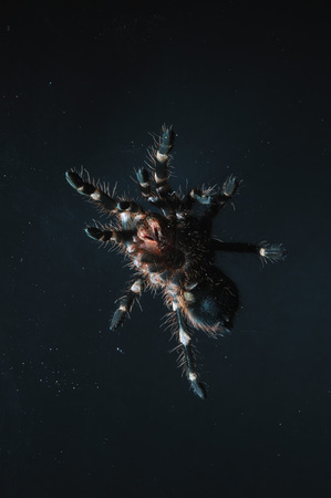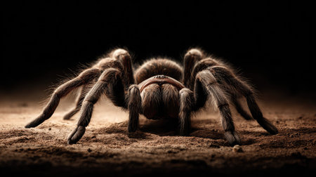 A detailed image of a tarantula spider is captured, showcasing its hairy texture and multiple legs. The composition features the arachnid against a dark background, possibly suggesting a natural environment. The lighting emphasizes the spider's form. This image could be suitable for educational materials or nature-related content.
