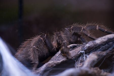 Top view on female Tarantula spider. Big hairy Arachnida on brown tree bark.