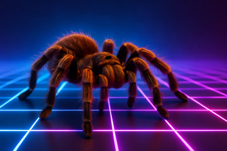 Large spider walking on glowing neon grid in a dark digital environment, creating a futuristic and surreal atmosphere