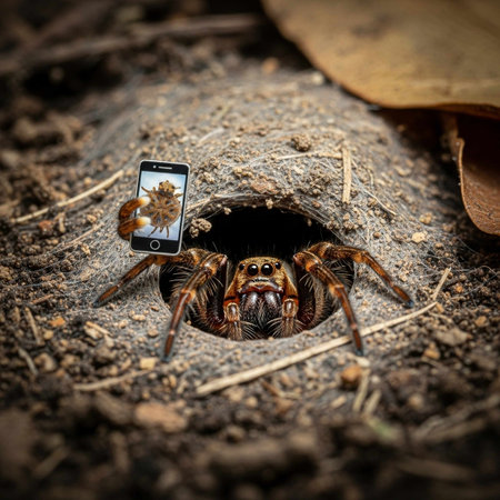 A striking close-up of a spider poised at the entrance of its dark burrow, surrounded by a web and fallen leaves, epitomizing nature's mysteries.