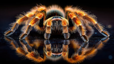 A striking macro shot presents a colorful tarantula with orange and brown hues. The subject is well-lit, displaying textured hairs and sharp details. The reflective surface beneath creates a symmetrical composition. Suitable for various projects including educational content and illustrative purposes.