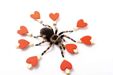 Mexican redknee tarantula female spider. Spider Tarantula brachypelma smithi on white background. Valentine's Day concept.