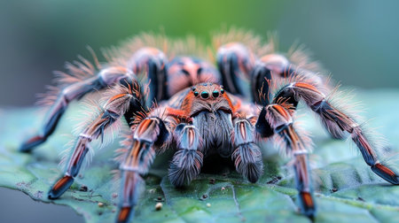 This macro photograph captures a vibrant and detailed view of a tarantula spider, showcasing its intricate features, colors, and textures found in nature.