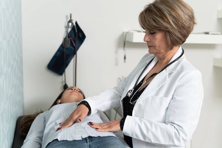 Close-up of doctor touching the stomach of the woman and holding medical exam