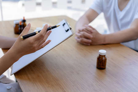 An examination room atmosphere in a hospital where doctors and patients are examining and diagnosing and prescribing medications for symptomatic treatment. The concept of disease diagnosis.