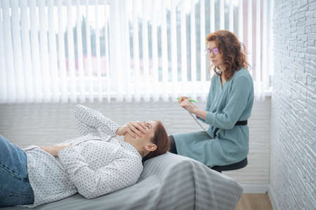 Caucasian woman crying while lying on the couch at a session with a psychologist.