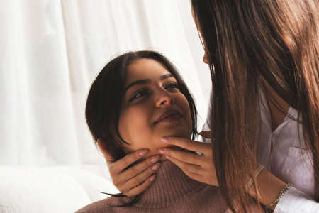 Young woman getting ultrasound examination of her thyroid by female clinician in whitecoat and protective mask and gloves