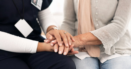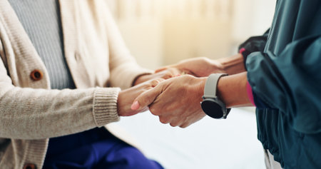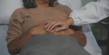 Close-up of a female doctor holding a patient's hand giving encouragement and advice at Medicare Clinic Hospital Doctor talking to patient, giving hope, mental health, therapy, com