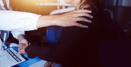 Supportive and comforting hands cheering up depressed patient person or stressed mind with empathy. Psychologist reassuring stressful and sad patient in vivancy clinic.