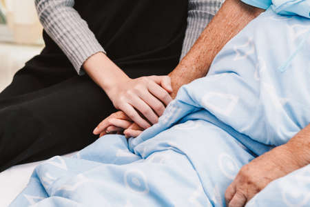 Close up granddaughter takes care of the health sick grandmother at home by holding hands. Lifestyle support the love of the family.