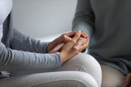Female friend or family holding hands during cheer up to mental depress man, Psychologist provides mental aid to patient. PTSD Mental health concept.